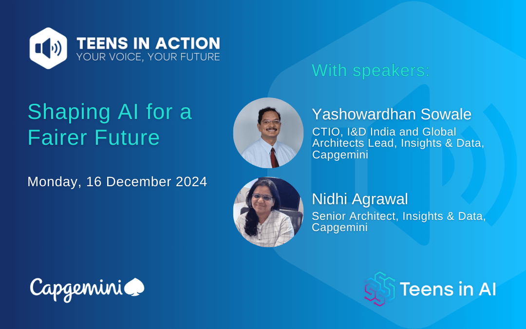 Join Teens in AI and CapGemini, on a session with Nidhi Agrawal and Yashowardhan Sowale on Shaping AI on a Fairer Future with AI Ethics and Generative AI.