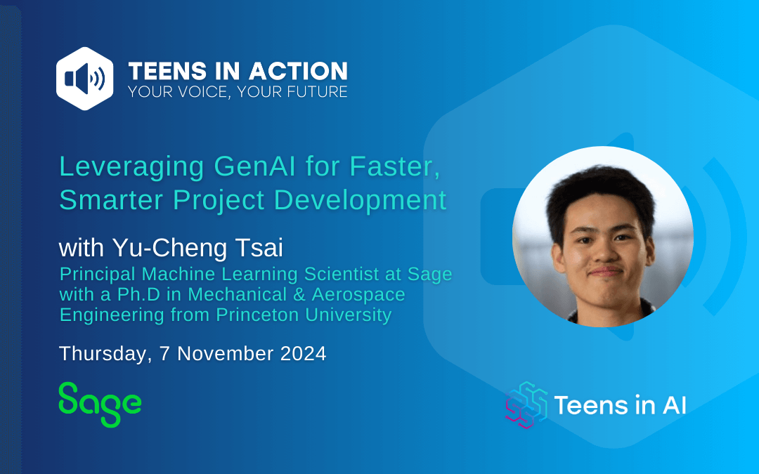 Join Teens in AI and Sage, powered by Sage Foundation, on a session with Yu-Cheng Tsai, Prinicipal Machine Learning Scientist about how Generative AI has changed the way he approaches Data Science and Software Engineering.